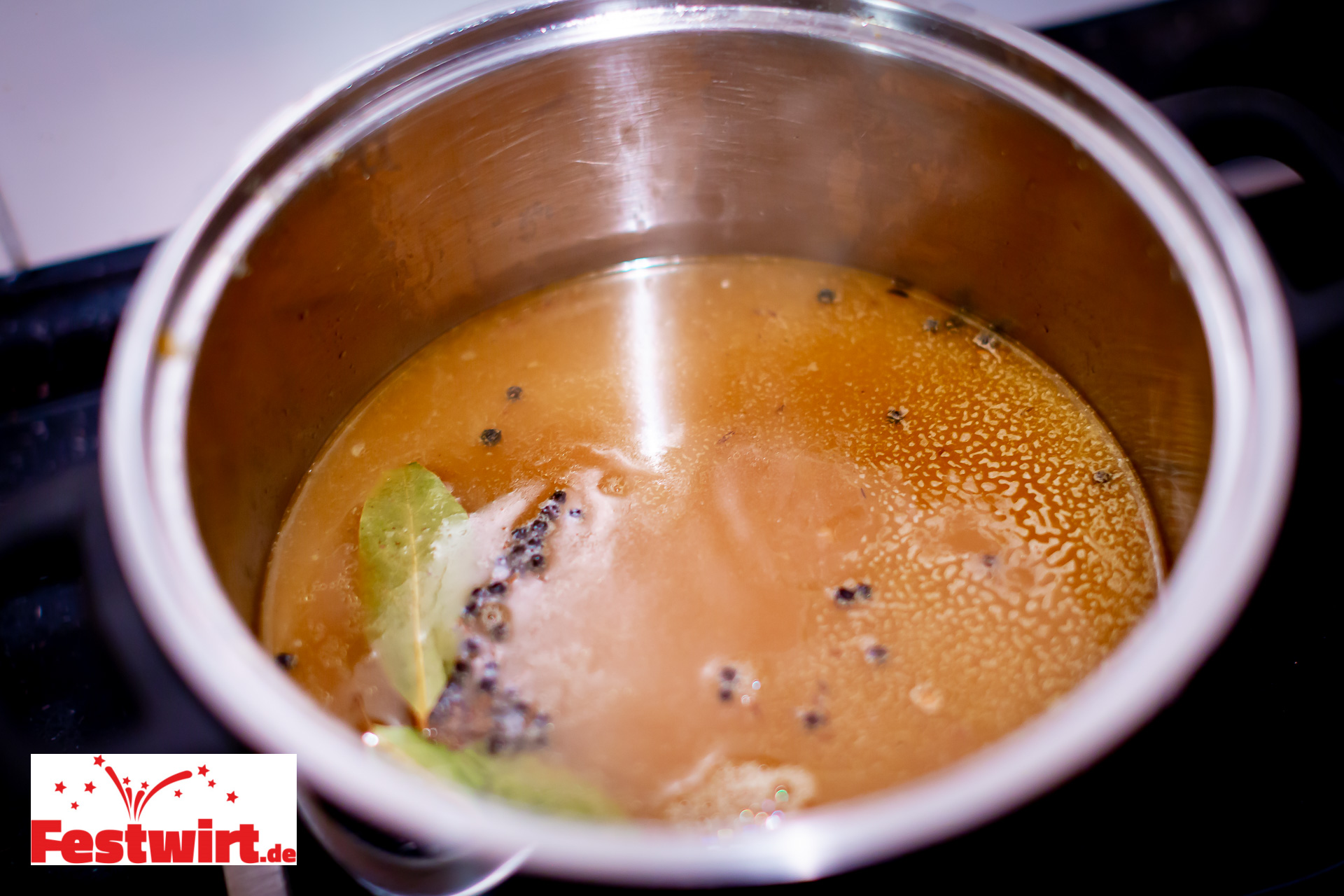 - Alles in einen großen Topf geben, mit Wasser auffüllen und ca. 4 Stunden bei niedriger Hitze köcheln lassen.